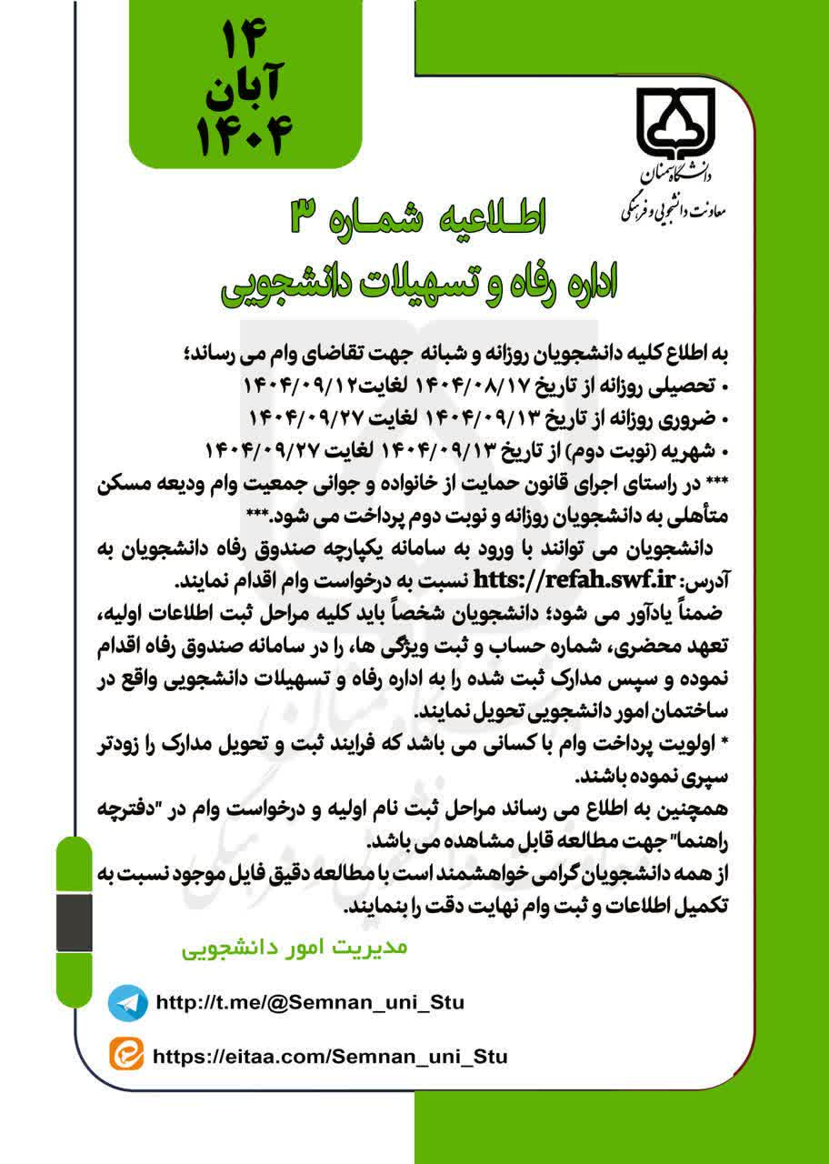 اطلاعیه شماره ۳ اداره رفاه و تسهیلات نیمسال اول سال تحصیلی 1405-1404 1404/08/18 - 11:22 تعداد بازدید: 68 قابل توجه کلیه دانشجویان روزانه و شبانه متقاضی وام صندوق رفاه کلمات کلیدی