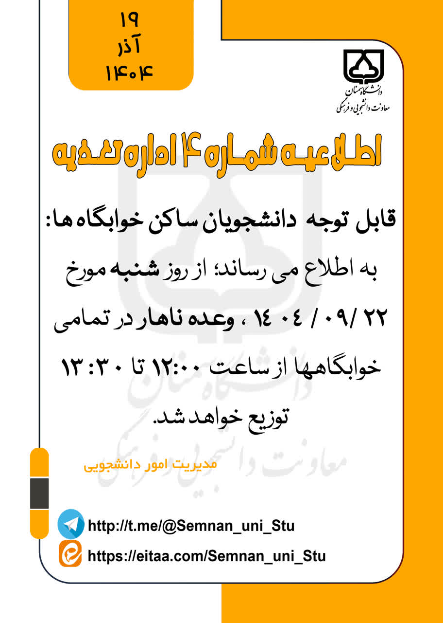 اطلاعیه شماره 4 اداره تغذیه نیمسال اول سال تحصیلی 1405-1404 1404/09/29 - 10:13 تعداد بازدید: 34 کلمات کلیدی